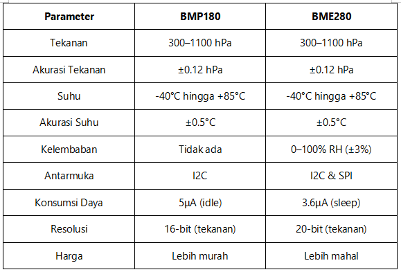 Berdasarkan tabel di atas, terlihat bahwa BME280 memiliki keunggulan dalam hal fitur tambahan (kelembaban) dan fleksibilitas antarmuka (SPI & I2C). Namun, dalam hal akurasi tekanan, keduanya memiliki spesifikasi yang hampir sama (±0.12 hPa).